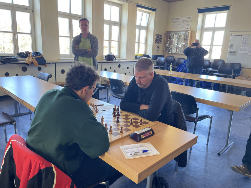 Die 1. Mannschaft war schon komplett fertig, bei der 2. Mannschaft bereits 5 Partien. Niels Hamann (rechts) versuchte am ersten Brett noch lange seinen Mehrbauern zum Gewinn zu verwerten. Die Partie endete aber remis.