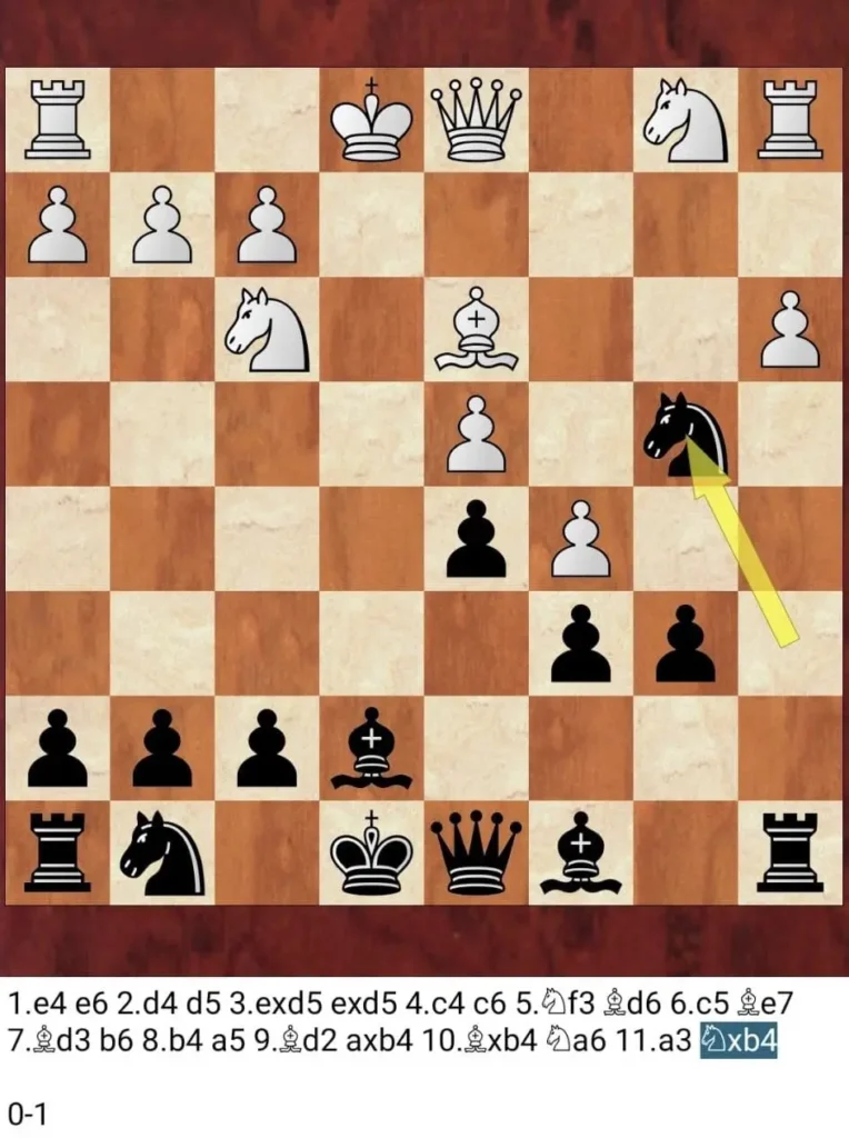 Notation und Schlussstellung der oben beschriebenen, elfzügigen Gewinnpartie von Robert Balder an Brett 2!
