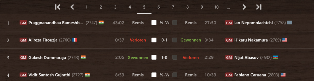 Es war definitiv kein Spieltag für schwache Nerven. In der Partie Praggnanandhaa – Nepomniachtchi überspielte Pragg seinen Gegner, der als Spezialist der Russischen Verteidigung gilt, mit einer vorbereiteten Eröffnungsneuerung, einem sehr starken Bauernopfer, welches Nepo einiges Kopfzerbrechen bereitete, und ihn zur äußerst präzisen Verteidigung einer schlechteren Stellung zwang. Pragg verpaßte in der entscheidenden Stellung die stärkste Fortsetzung, und so konnte sich der Russe – etwas glücklich, aber nicht unverdient – in ein Remis retten.