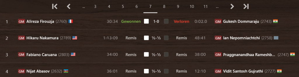 Die zweite bemerkenswerte Partie ist die Niederlage von Gukesh mit Schwarz gegen Firouzja. Gukesh spielt eine starke Partie, hat lange Zeit sowohl auf dem Brett als auch auf der Uhr einen deutlichen Vorteil, aber während Firouzjas haarsträubender Zeitnotphase verliert er völlig den Faden, verbrennt fast seine gesamte Restbedenkzeit UND läßt auch noch starkes weißes Gegenspiel zu, das schließlich in einem zwingenden Mattangriff für Weiß endet. Dass es Firouzja gelingt, so eindrucksvoll eine fast verlorene Stellung noch zu drehen, sollte ihm Auftrieb für die zweite Hälfte des Turniers geben.
