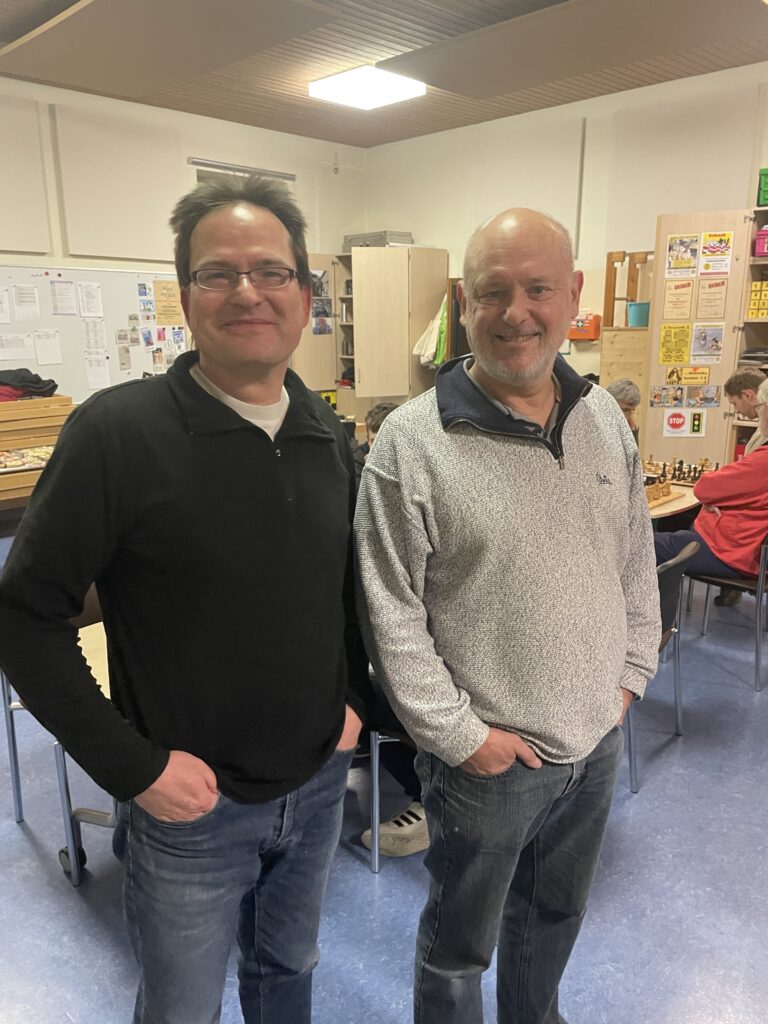 Zwei Titelträger auf einem Bild: Großmeister Stefan Bromberger, im Hintergrund vor dem offenen Fenster Fidemeister Stefan Bocksberger.