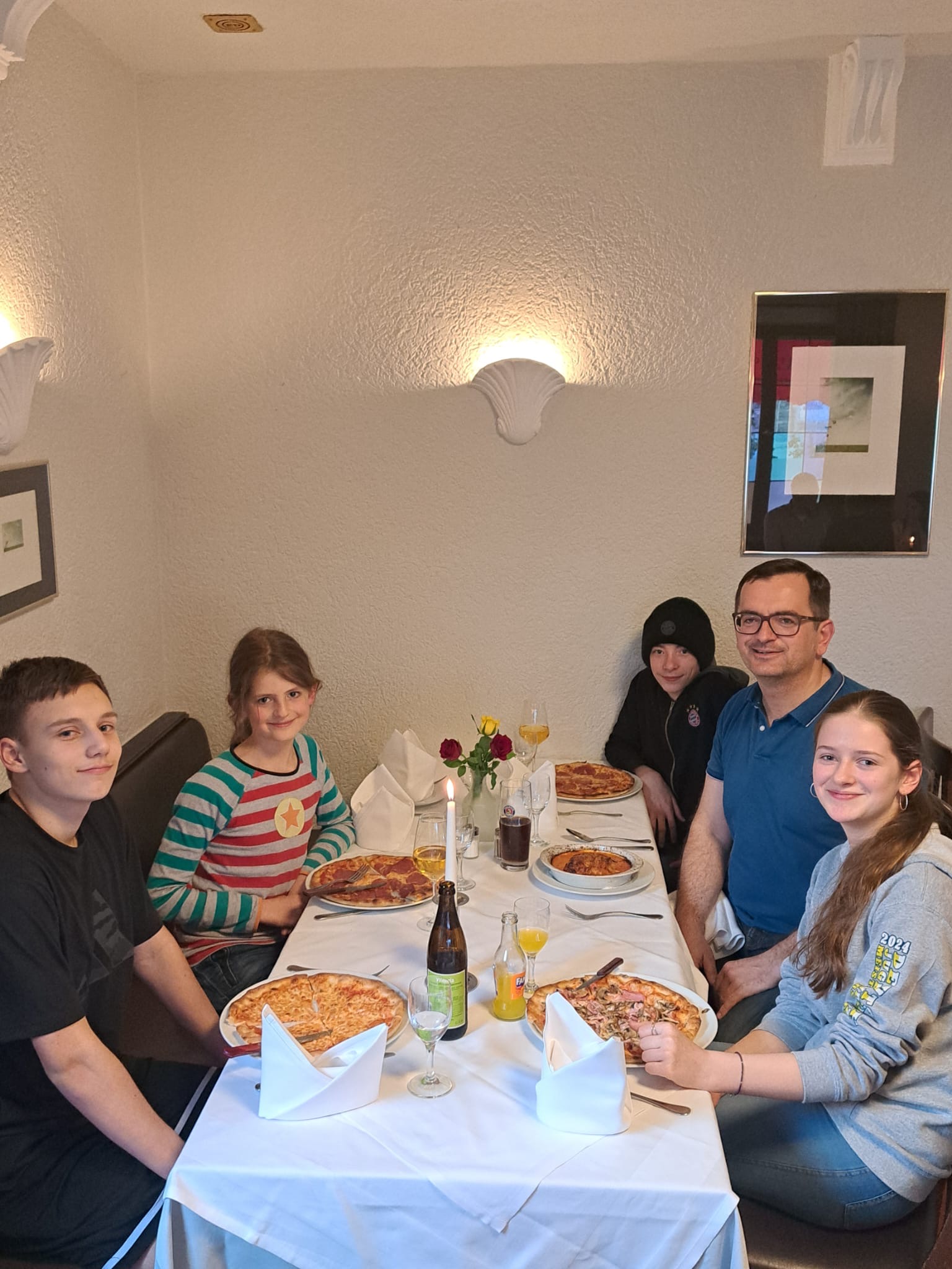 Dies hinderte die Mannschaft, die heute mit Marlene Prokscha, Nicola Reichert, Kilian Prokscha und David Prassas antrat, aber nicht, sich gemeinsam mit Armin Prokscha, leckere Pizzas zu genießen (siehe Beitragsbild).