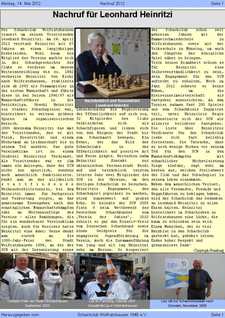 Am 24.04.2012 verstarb unser langjähriger erster Vorsitzender Leonhard Heinritzi. „Leo“ wurde am 04.03.1945 geboren und wechselte 1982 vom Schachclub Bichl zu uns nach Wolfratshausen. Seine unzähligen Verdienste für unseren Club hat Christoph Humburg seinerzeit im Nachruf für Leo zusammengefasst: