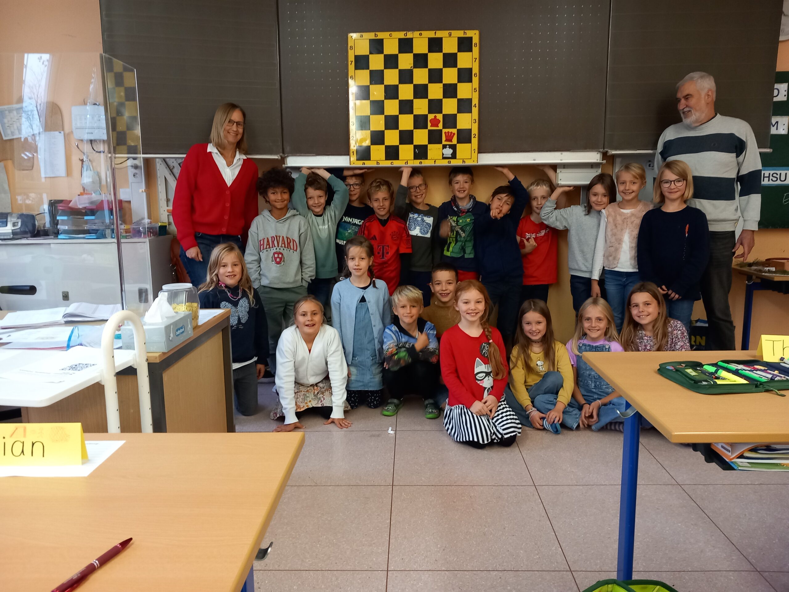Im Rahmen der Kinderkulturtage haben Michaela Fuchs und ihre Klasse 3d der Grundschule in Weidach den benachbarten Schachclub Wolfratshausen eingeladen. Jugendleiter Renato Wittstadt nahm diese Einladung gerne an und war überrascht, wie viel Schachwissen die Schüler schon hatten. Für gute Beiträge hatte er einige Mitbringsel dabei, die schnell vergriffen waren. Zum Abschluss spielte er zwei Endspiele (König gegen König und Dame; König gegen König und Bauer) auf dem Demobrett: das erste gewann die Klasse 3d (Mattbild siehe Foto im Hintergrund auf dem Demobrett), das zweite endete Patt (unentschieden). Mit der Einladung zu gelegentlichen Gegenbesuchen an Schultagen, die auf einen Freitag fallen, (jeweils ab 18 Uhr im Bürgerhaus Weidach) verabschiedete er sich.